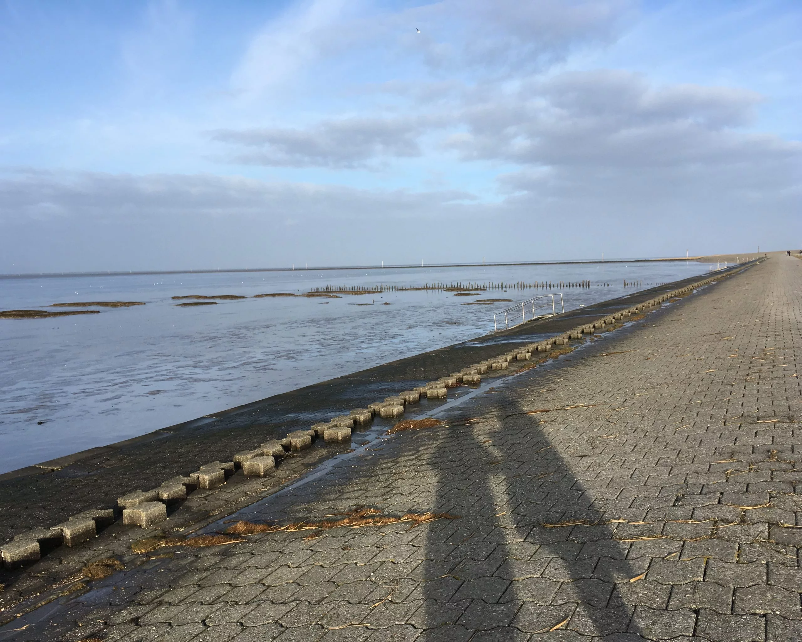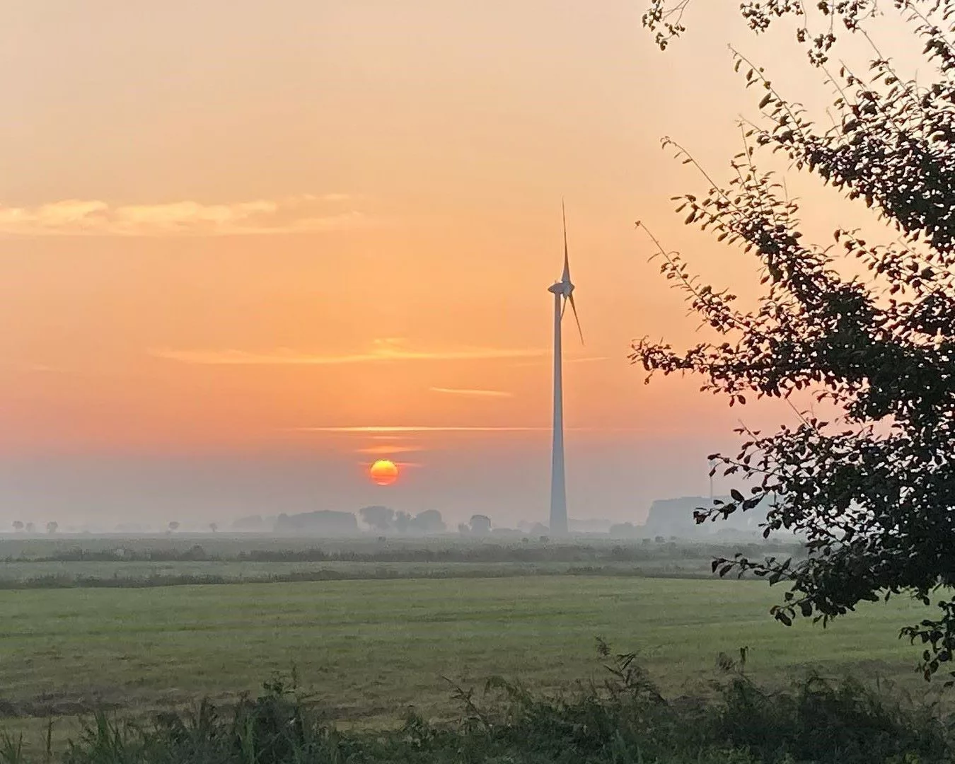 Blick über ein Feld im Sonnenuntergang mit Schatten eines Menschen und Mond am Himmel