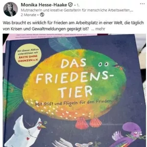 => vorgestellt wird ein humorvolles Buch, eine Sammlung kreativer Texte über Friedenstiere, dessen Erlös für einen guten Zweck ist. Dabei geht es um Konfliktprävention in der Familie und am Arbeitsplatz: