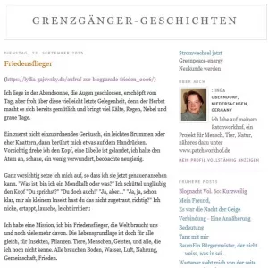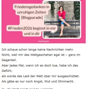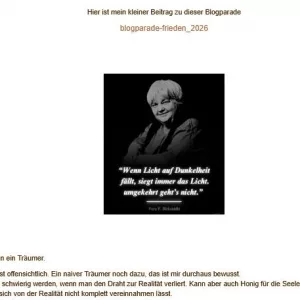 Viele haben sich an der Blogparade beteiligt, Beiträge beigesteuert, oder waren in Gedanken und mit Kommentaren dabei. Danke! Wir brauchen Friedensgedanken, das darüber Sprechen und die Zuversicht, dass wir daran mitwirken können, dauerhaft und permanent. Damit nicht der Krieg zur Normalität wird, sondern unsere ☮️ Friedensbemühungen.